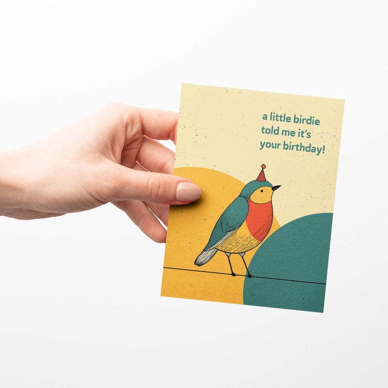 Printed on high-quality 16pt cardstock with a shine-free matte coating on the image side for a premium feel. Blank inside. Comes with a kraft envelope in a clear sleeve. Sweet, cheerful, and just the right amount of quirky—this card features a charming party-hat-wearing bird ready to deliver some birthday cheer. With its clean, colorful design and the playful message “a little birdie told me it’s your birthday!”, it’s a delightful way to brighten someone’s special day.